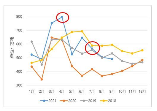 值得注意的是,2021年,财政部、税务总局分别于4月底和7月底发布了关于取消(部分)钢铁产品出口退税的公告。对比历年钢材月度出口量变化,除5月钢材出口受退税调整影响,单月出口量环比降幅较大外,其他月份钢材出口量受出口政策调整影响较小。